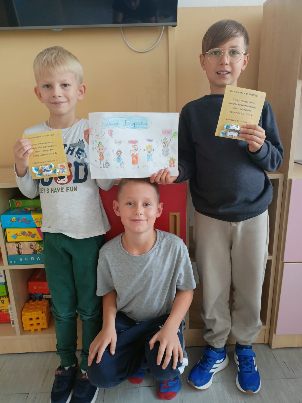 Dnia 30 września w naszej świetlicy obchodziliśmy Dzień Chłopaka. Z tej okazji dziewczynki przygotowały dla kolegów laurki z życzeniami. Wspólnie odśpiewaliśmy także wesołą piosenkę dla chłopców, składając im najlepsze życzenia.
