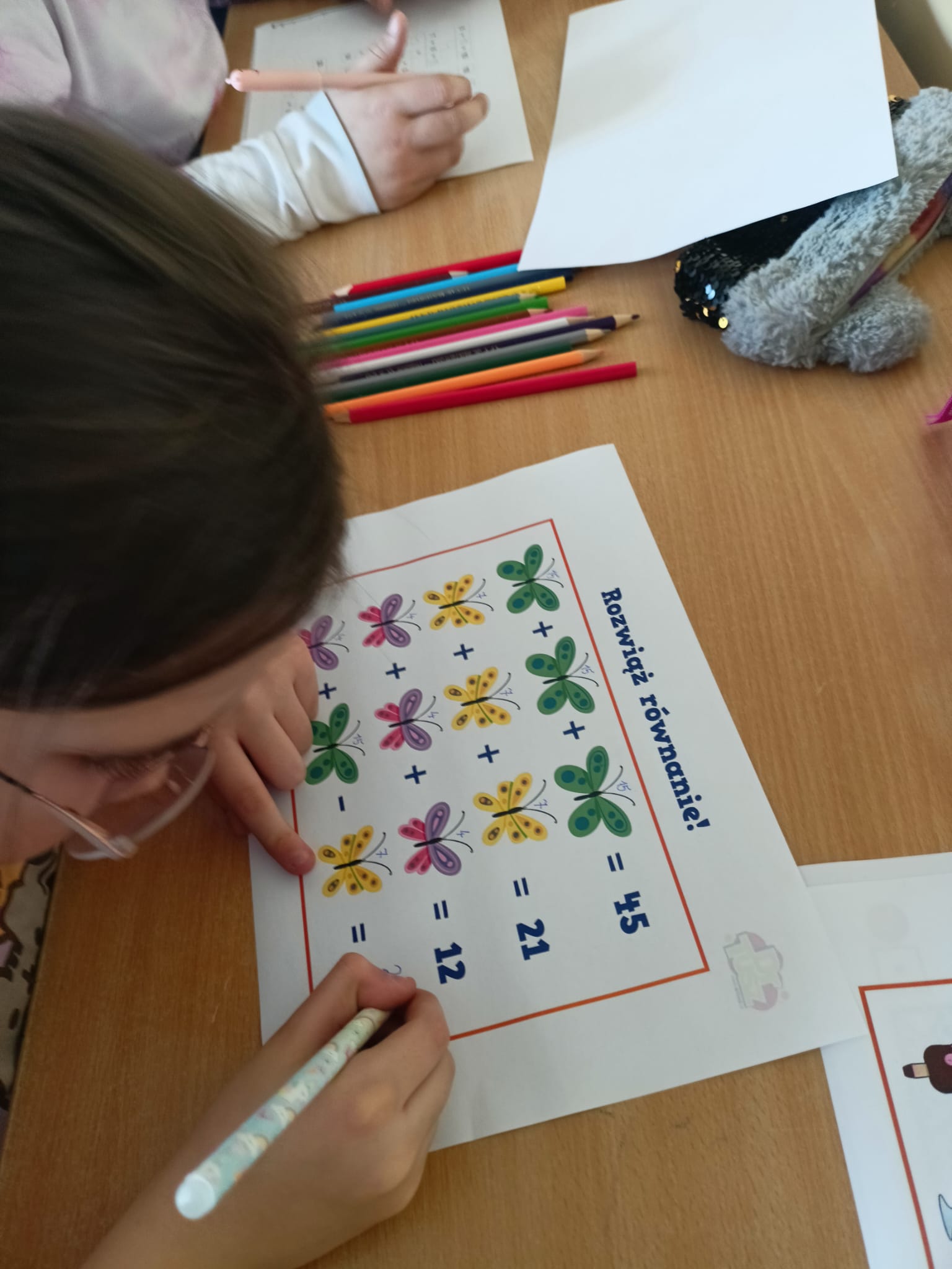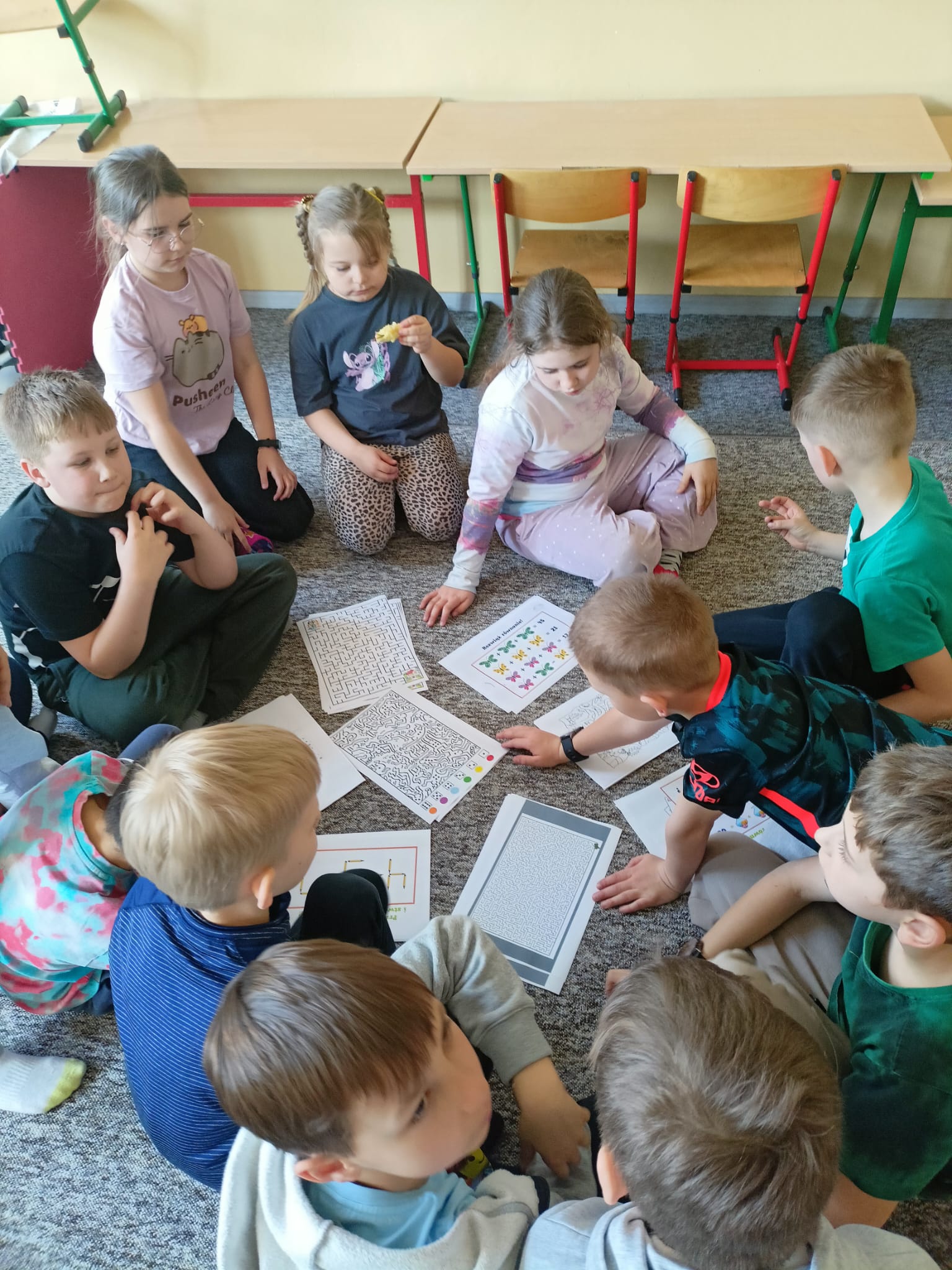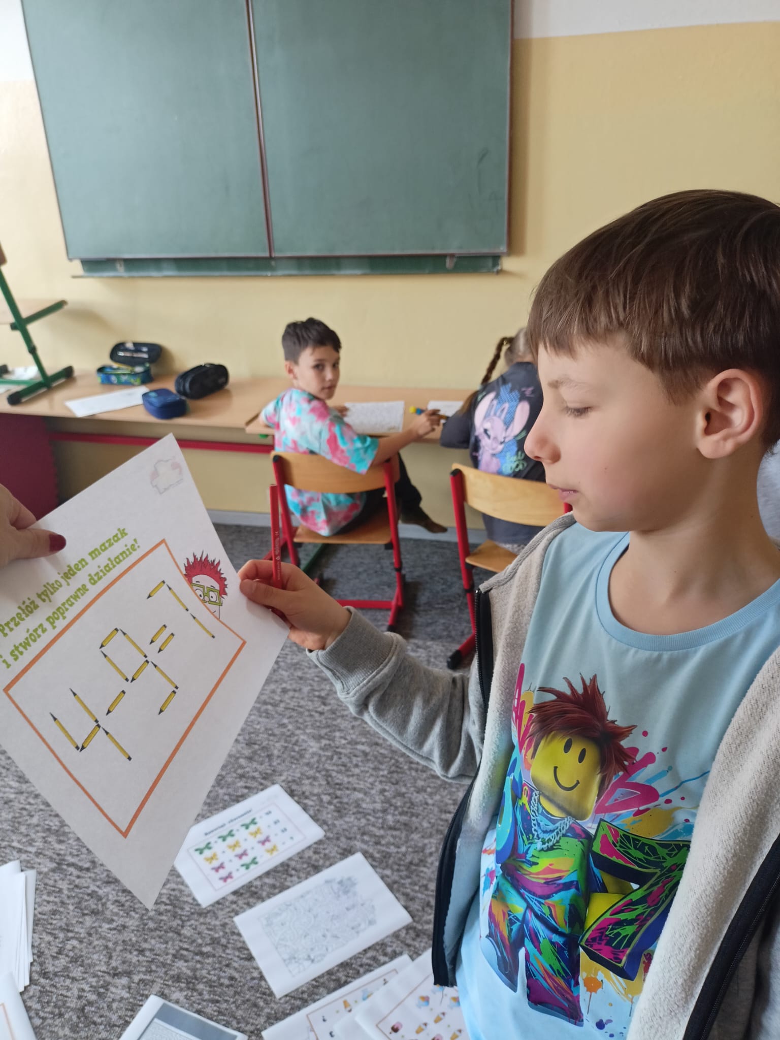 Podczas zajęć uczniowie rozwiązywali różnorodne łamigłówki matematyczne, rebusy oraz interesujące zadania logiczne. Nie zabrakło również zagadek wymagających sprytu, spostrzegawczości i współpracy w grupie. Dzieci z dużym zaangażowaniem podejmowały kolejne wyzwania i chętnie dzieliły się swoimi pomysłami na rozwiązania.