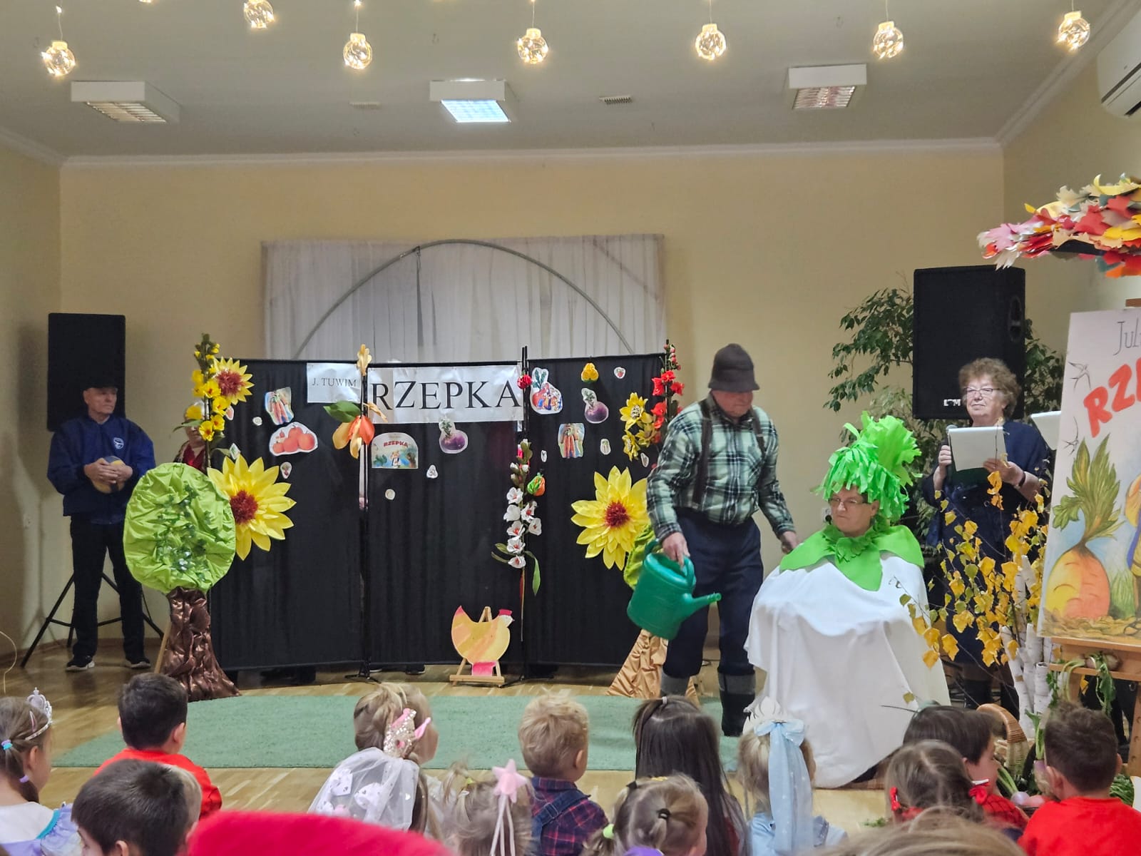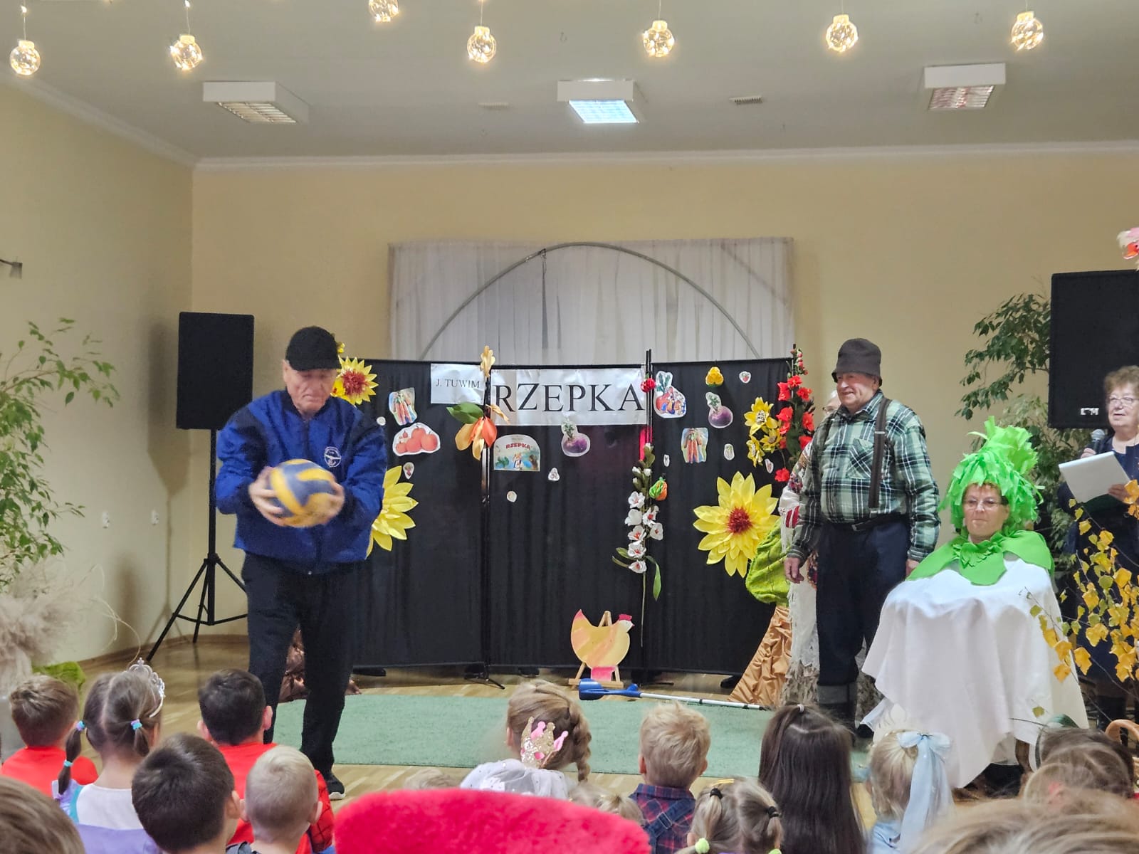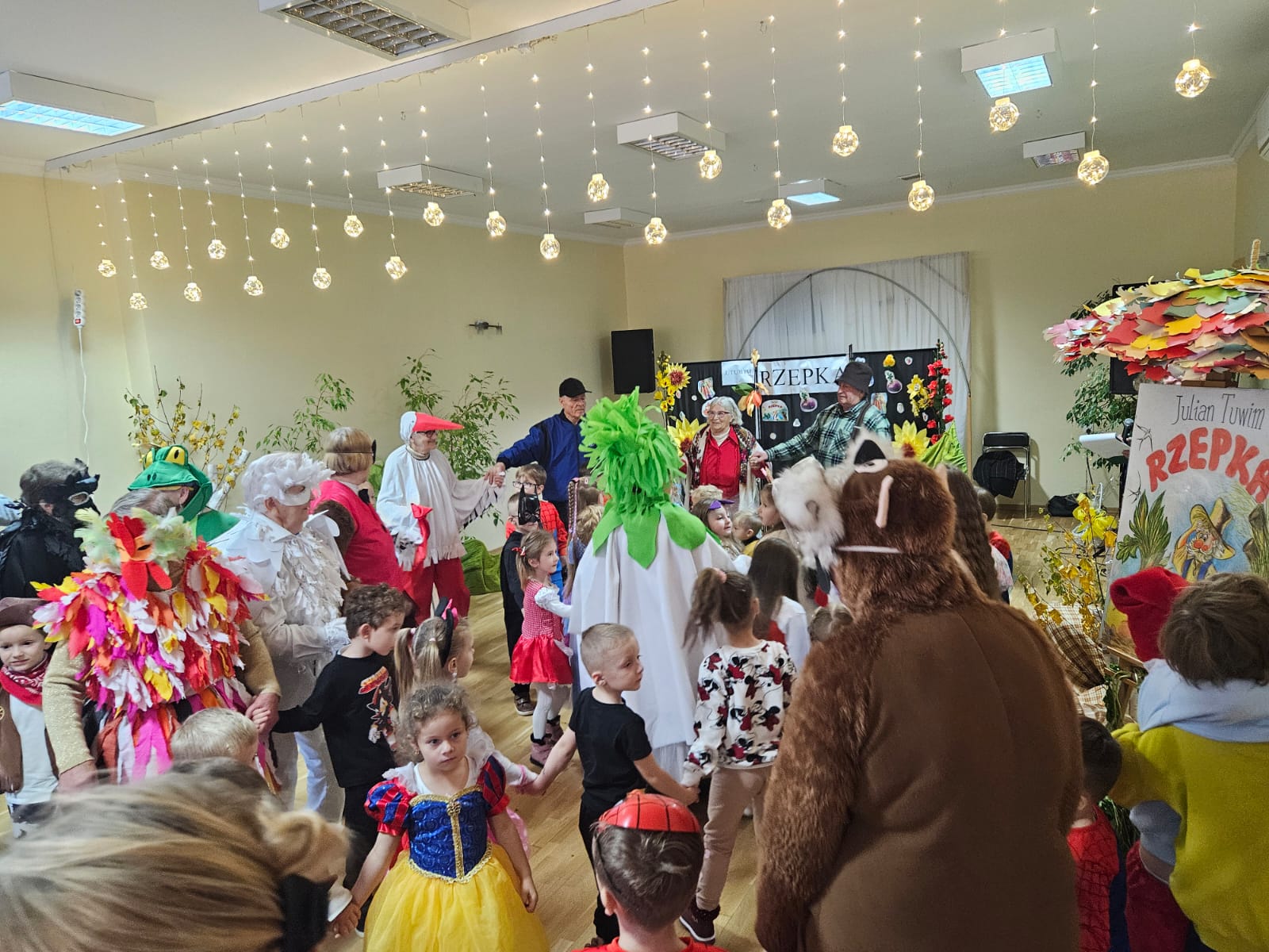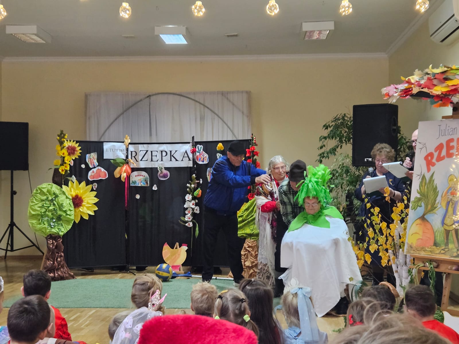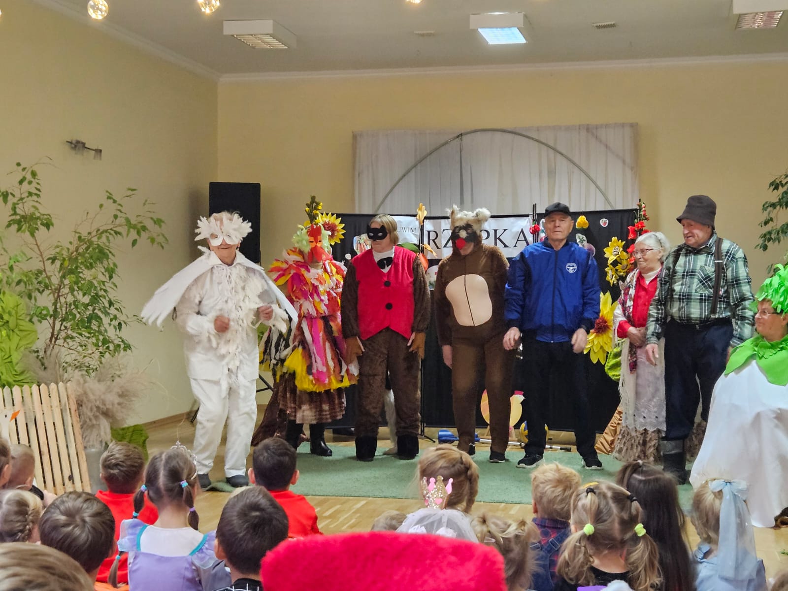Nie zabrakło również części artystycznej — Seniorzy z ogromnym zaangażowaniem przedstawili inscenizację znanej baśni „Rzepka”, która wywołała wiele śmiechu i radości wśród najmłodszych. Wspólne zabawy w kole z uczniami i przedszkolakami wniosły mnóstwo uśmiechu i pozytywnej energii.