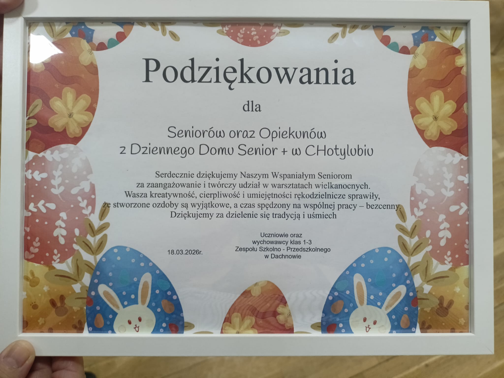 W dniu 18 marca 2026 r. w Domu Kultury w Dachnowie odbyły się wyjątkowe warsztaty świąteczne dla uczniów klas 1–3, zorganizowane przez Dzienny Dom Senior+ w Chotylubiu.