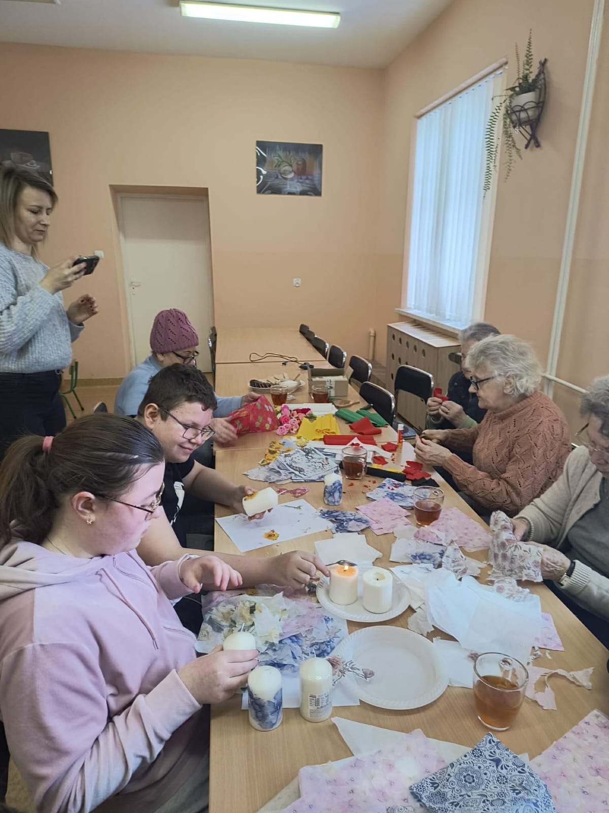 Szczególnego charakteru wydarzeniu dodała obecność i pomoc pani Justyny Młodzińskiej wraz z paniami z Dziennego Domu Seniora w Chotylubiu. Pani Justyna z seniorkami z ogromnym zaangażowaniem dzieliła się swoim doświadczeniem, cierpliwie instruując uczniów i wspierając ich na każdym etapie pracy. Wspólne działania sprzyjały rozmowom, integracji międzypokoleniowej oraz budowaniu relacji opartych na życzliwości i wzajemnym szacunku.