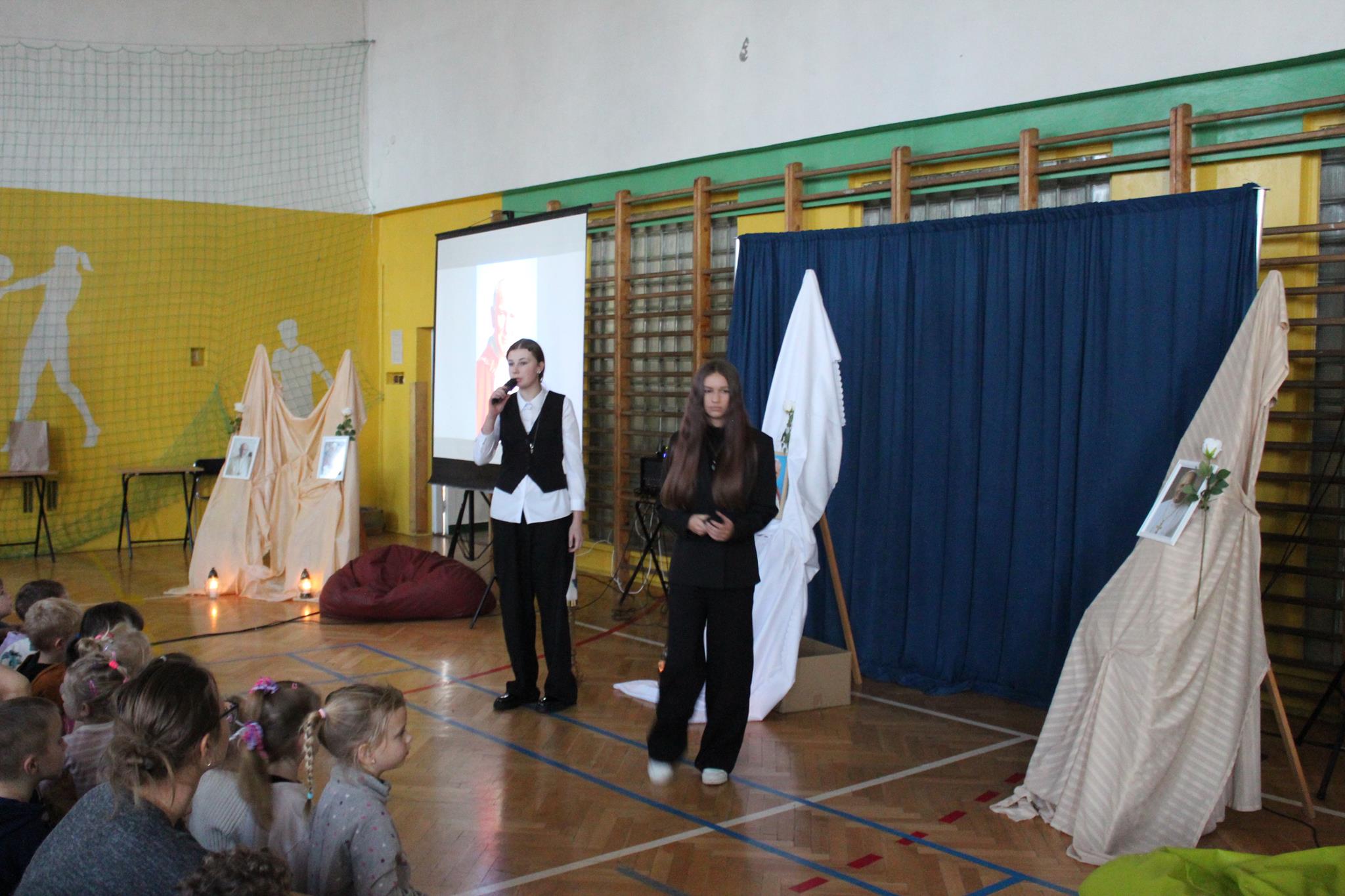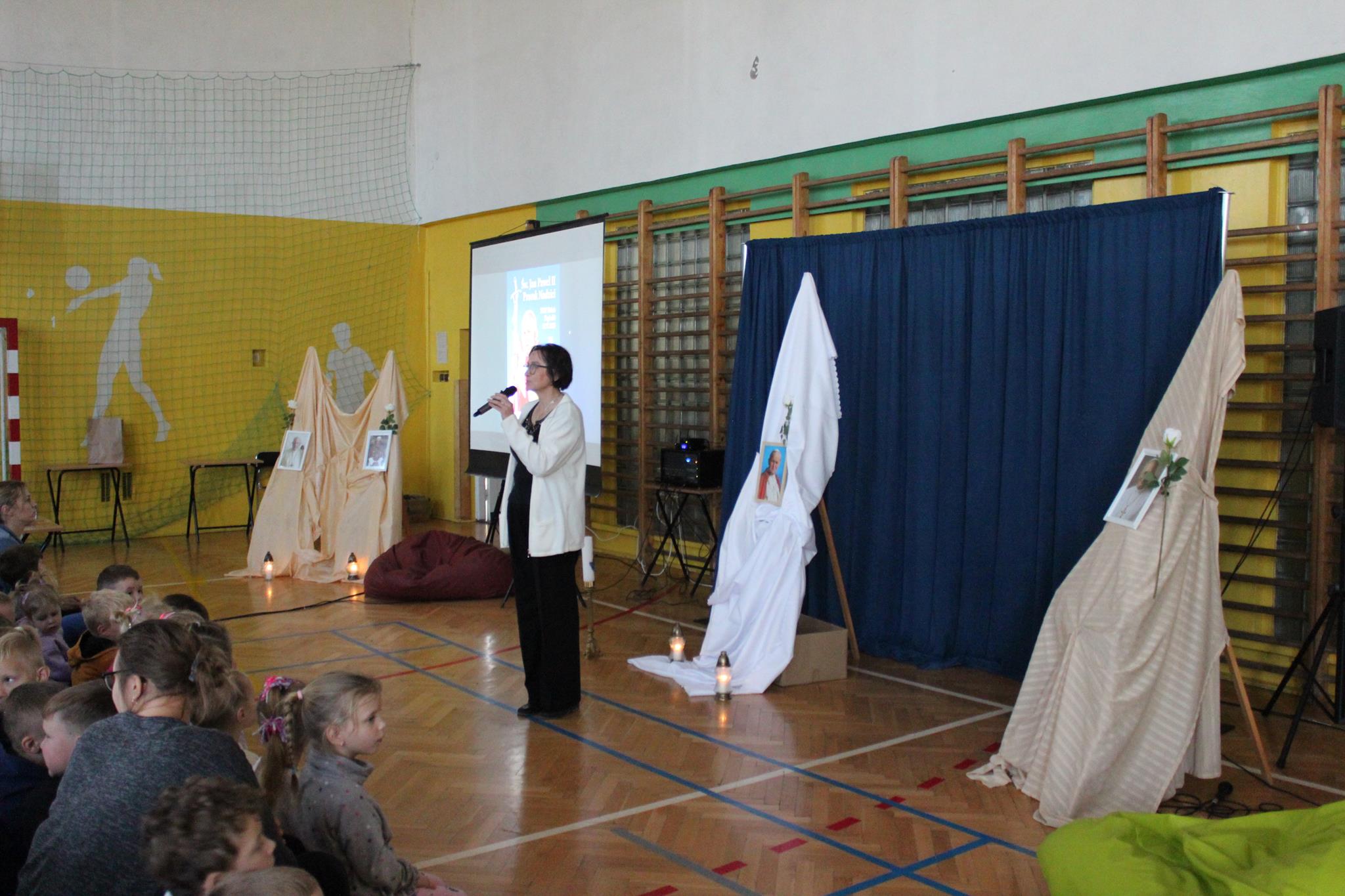 Podczas uroczystości mogliśmy wysłuchać przemówień nauczycieli i pana dyrektora, obejrzeć filmy o Janie Pawle II wyświetlane na projektorze, a także zobaczyć recytacje wierszy, występy uczniów oraz muzykę na żywo. Występy były bardzo ciekawe i wzruszające. Każdy z nich przypominał nam, jak dobrym i mądrym człowiekiem był Jan Paweł II – Prorok Nadziei.