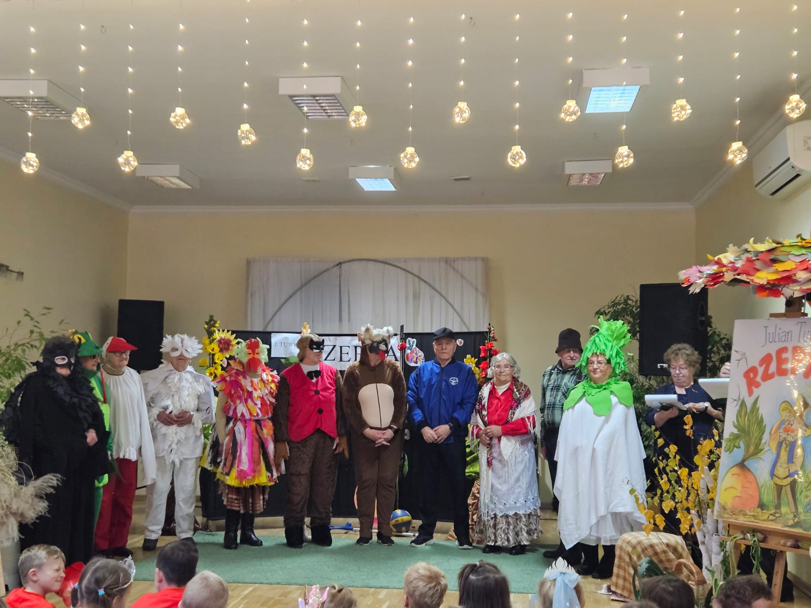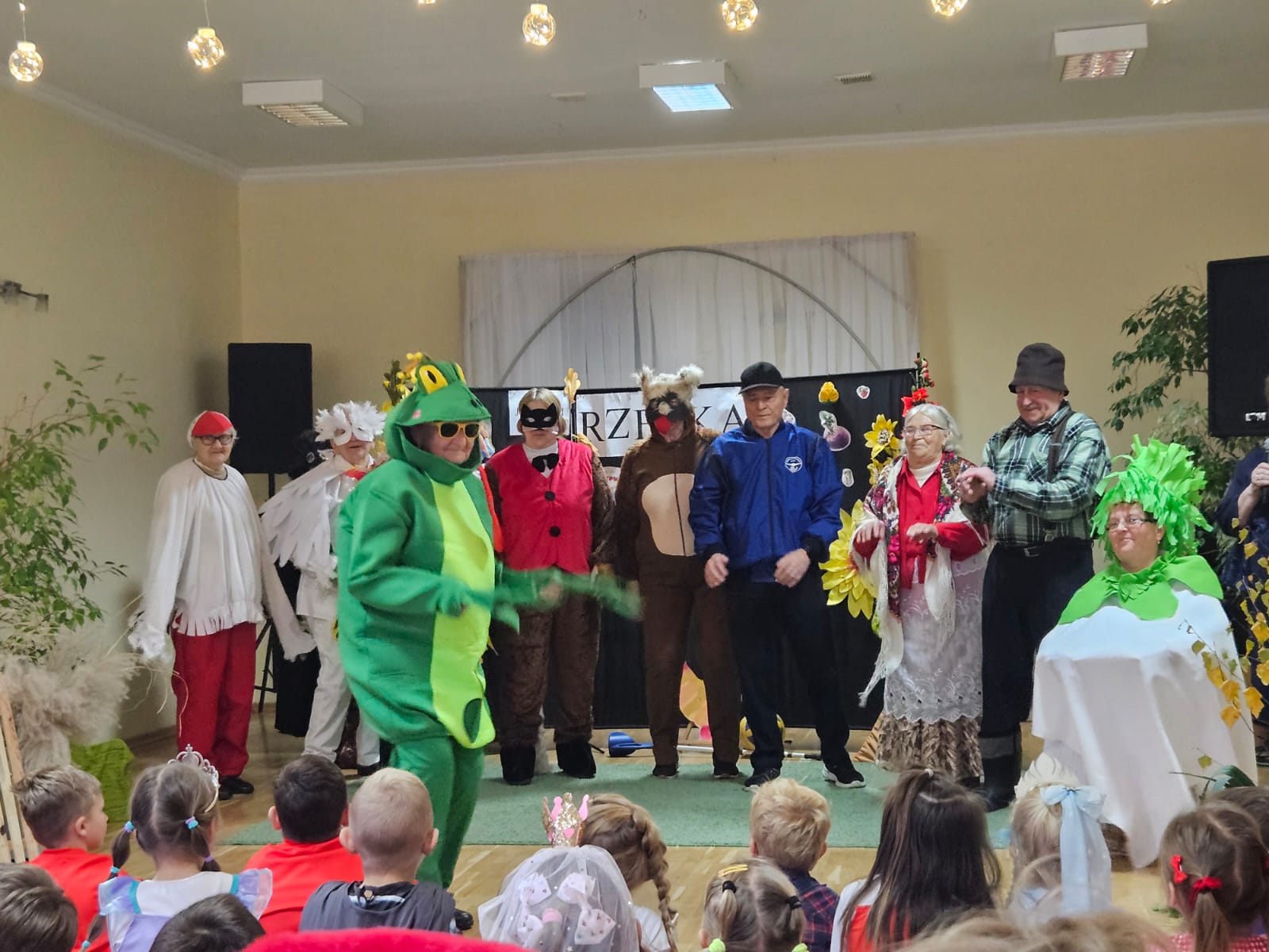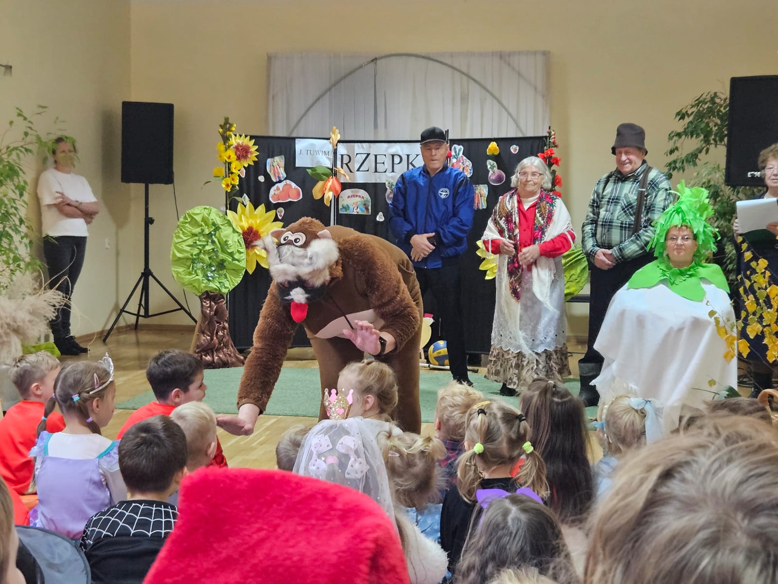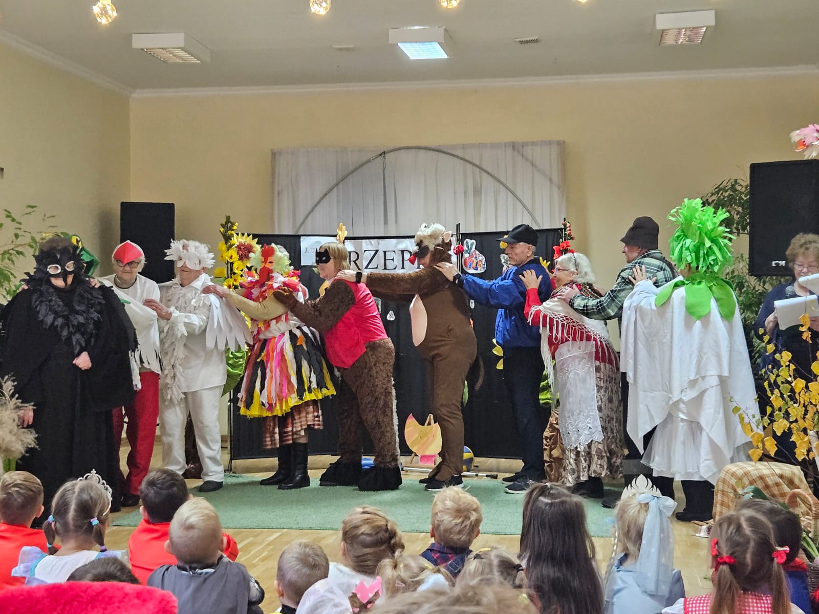 Nie zabrakło również części artystycznej — Seniorzy z ogromnym zaangażowaniem przedstawili inscenizację znanej baśni „Rzepka”, która wywołała wiele śmiechu i radości wśród najmłodszych. Wspólne zabawy w kole z uczniami i przedszkolakami wniosły mnóstwo uśmiechu i pozytywnej energii.