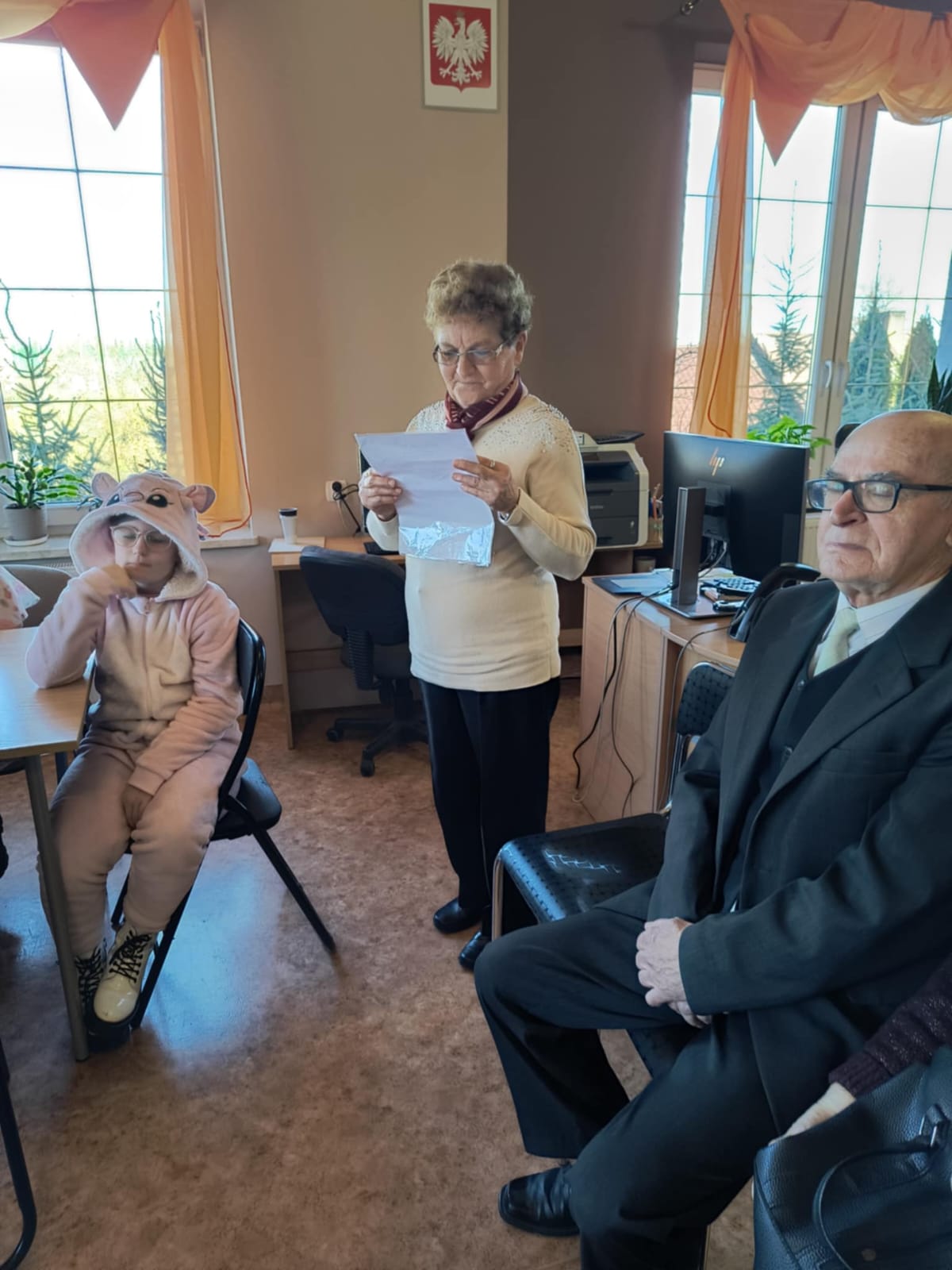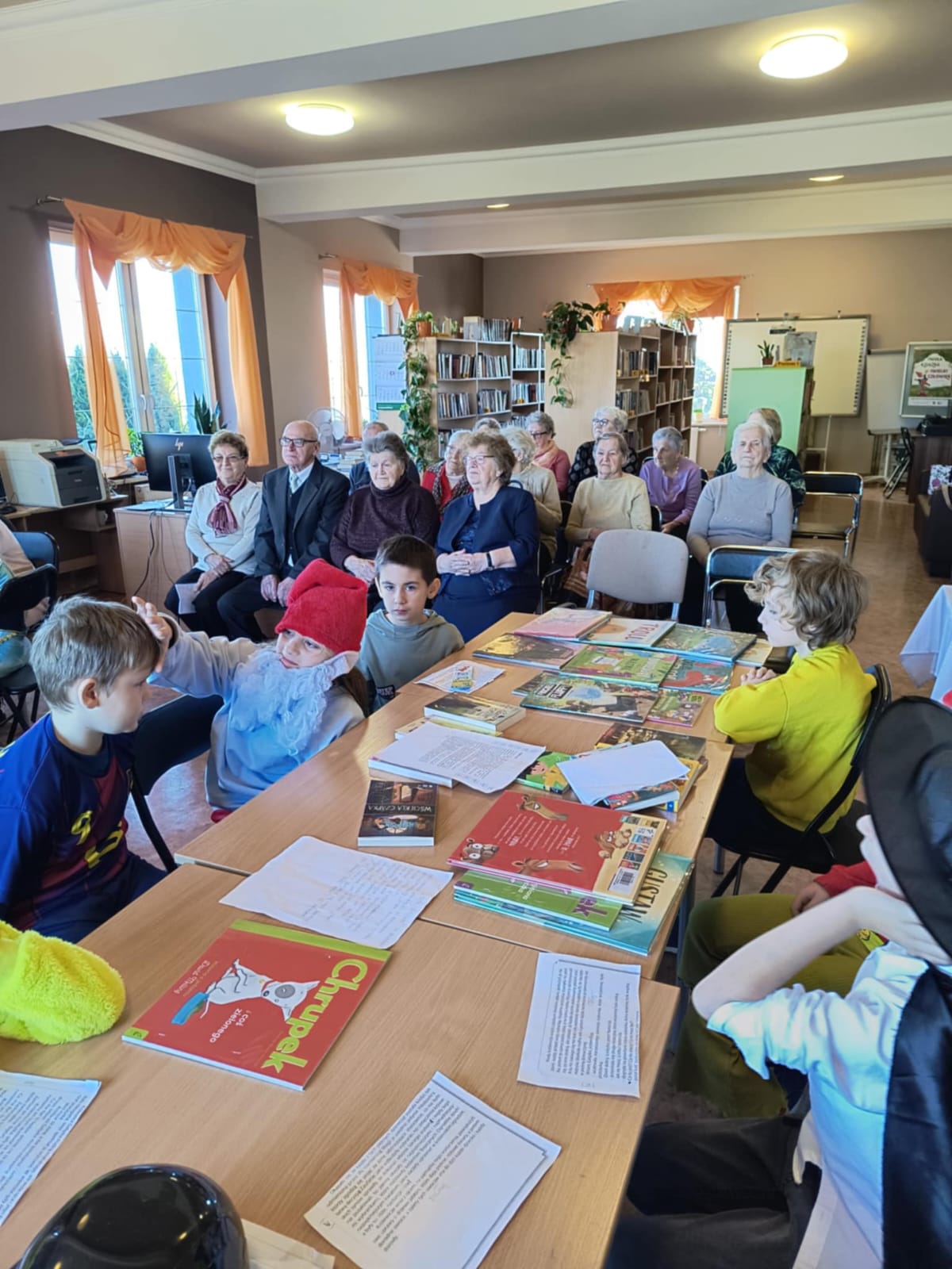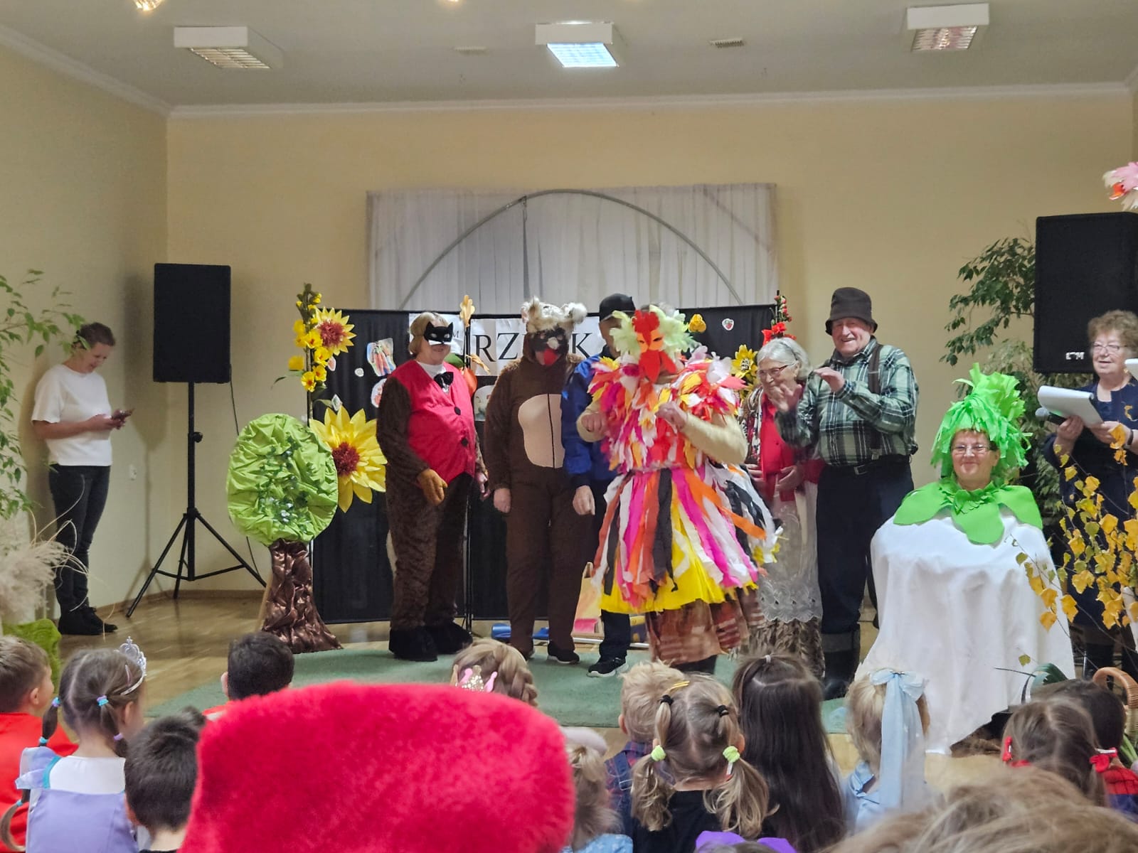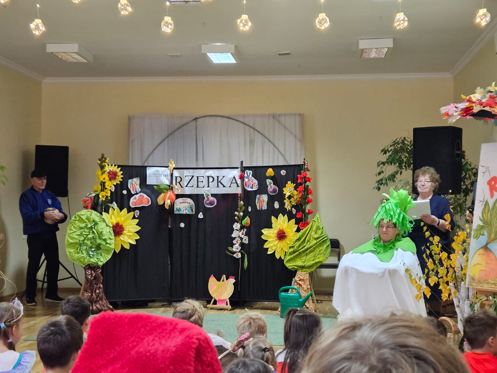 Nie zabrakło również części artystycznej — Seniorzy z ogromnym zaangażowaniem przedstawili inscenizację znanej baśni „Rzepka”, która wywołała wiele śmiechu i radości wśród najmłodszych. Wspólne zabawy w kole z uczniami i przedszkolakami wniosły mnóstwo uśmiechu i pozytywnej energii.
