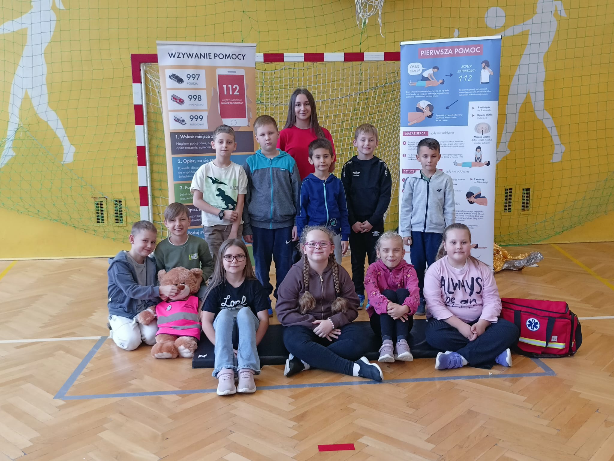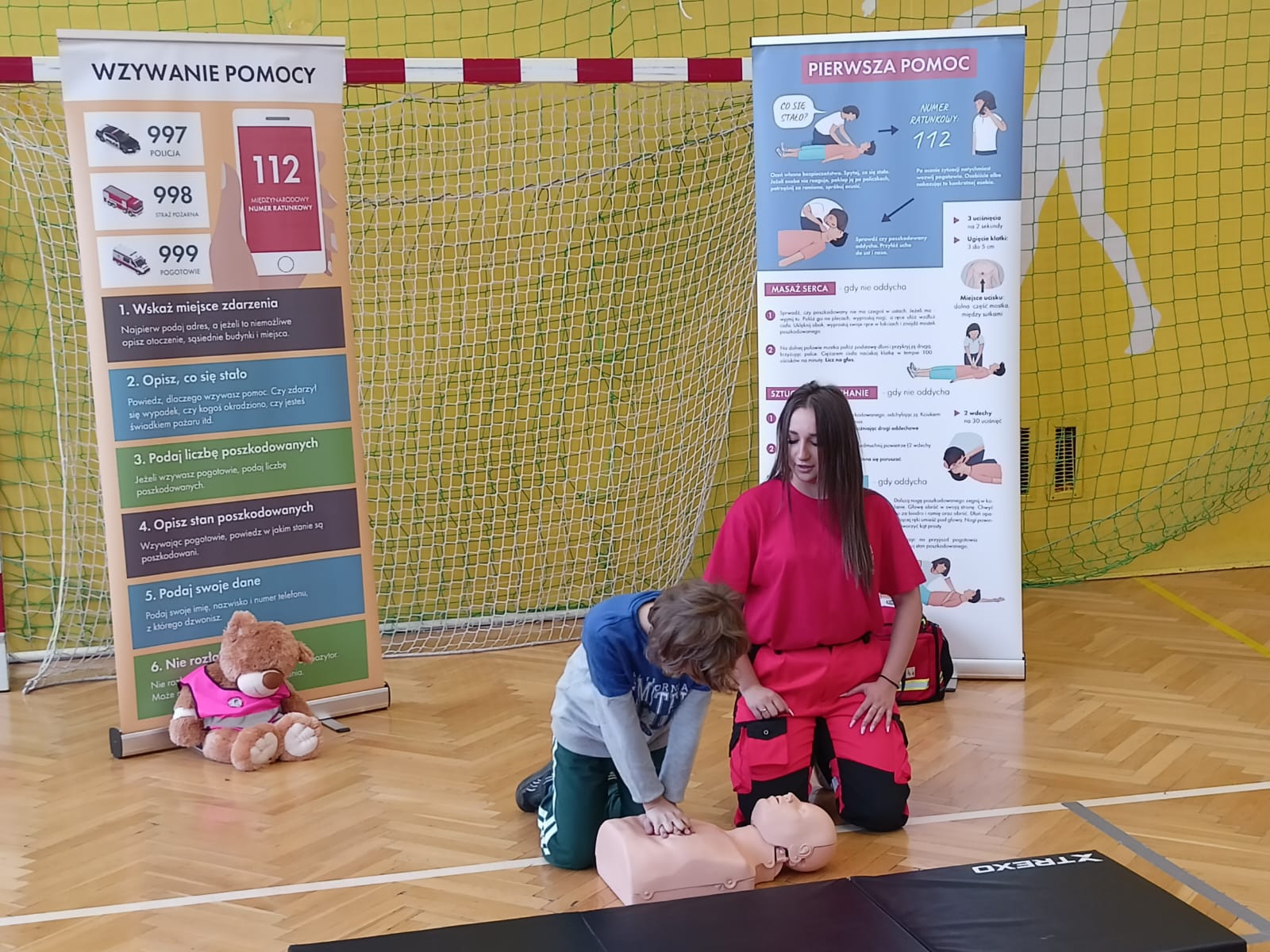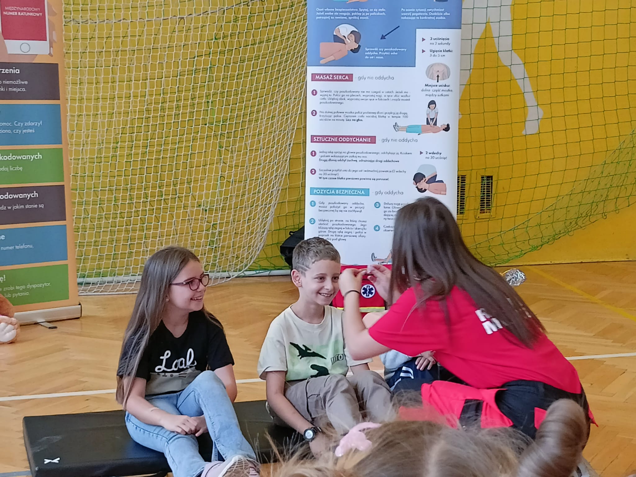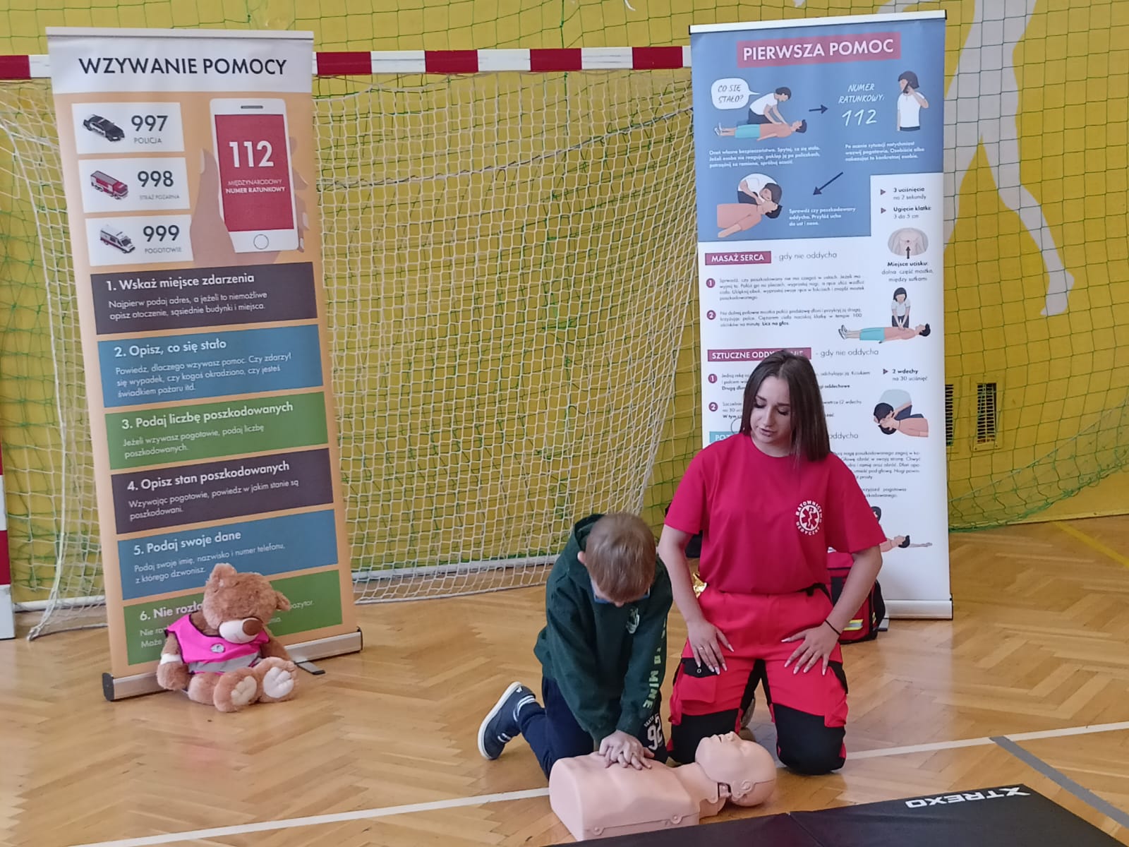 Uczniowie klas I–III wzięli udział w szkoleniu z zakresu pierwszej pomocy przedmedycznej, które poprowadził ratownik medyczny. Podczas zajęć dzieci uczyły się, jak prawidłowo wezwać pomoc, sprawdzić przytomność i oddech poszkodowanego oraz jak reagować w sytuacjach zagrożenia.