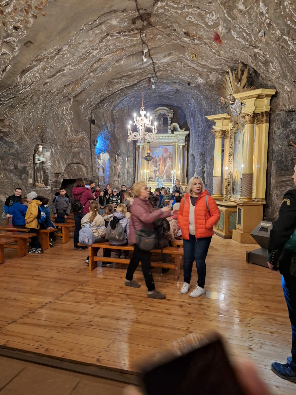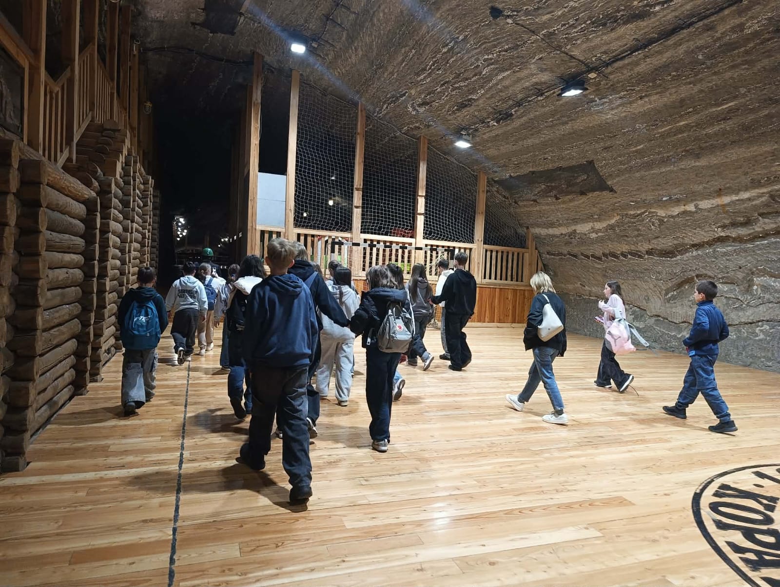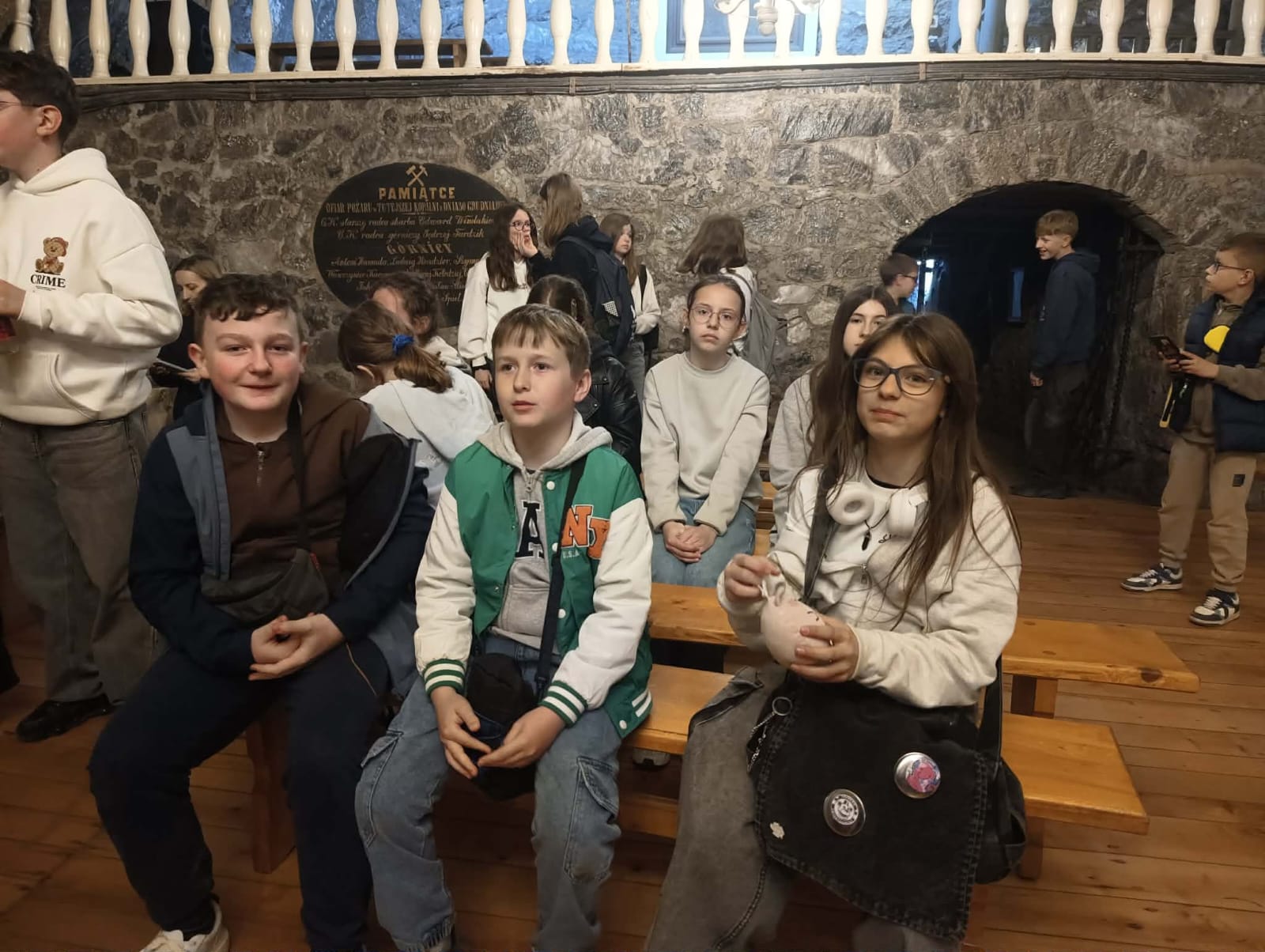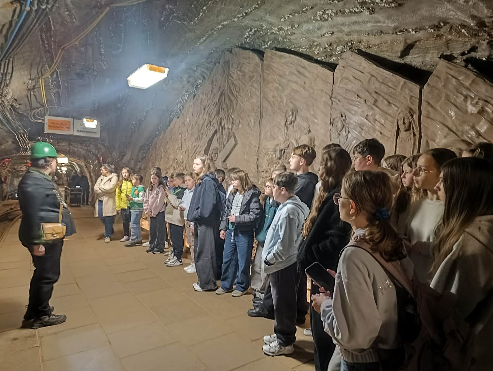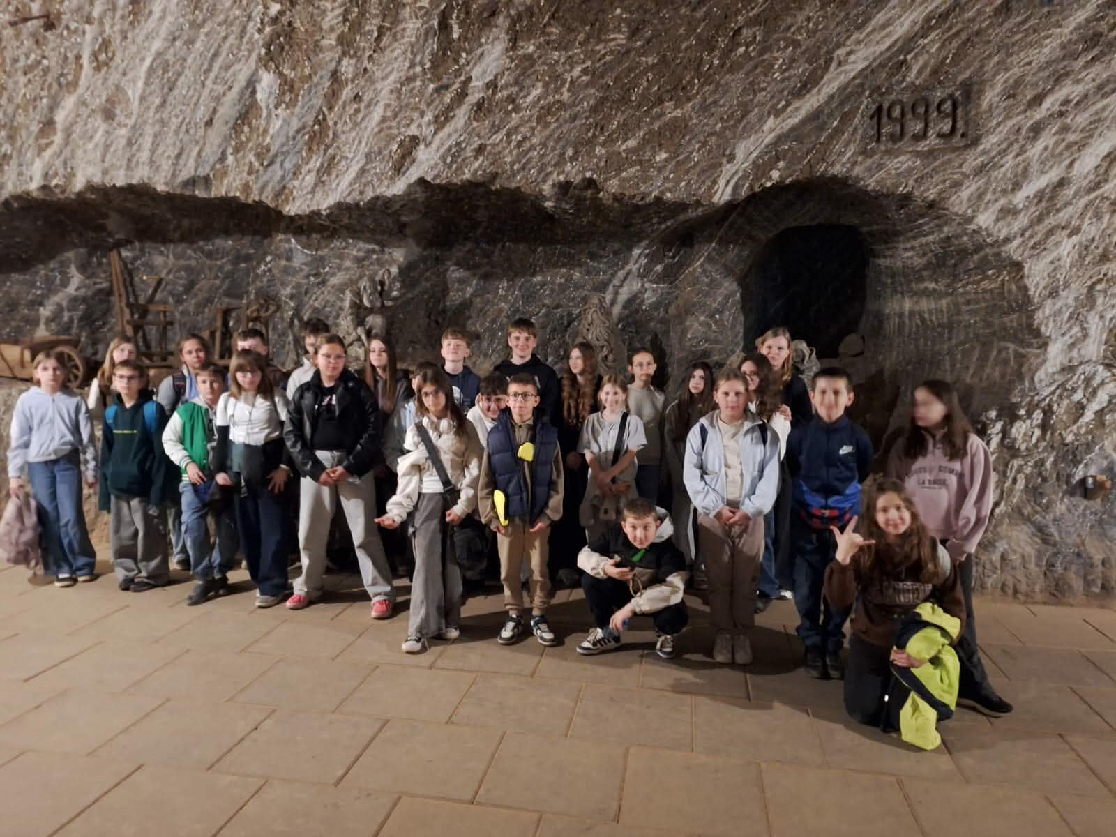 W dniu 16.04.2026r. klasy IV- VI uczestniczyły w wyjeździe edukacyjnym do Bochni i Krakowa. Wycieczka rozpoczęła się od zwiedzania Kopalni Soli w Bochni, gdzie pokonując najdłuższą trasę turystyczną, uczniowie mieli okazję poznać historię kopalni i miasta, przepłynąć łodzią po wodzie solankowej oraz spędzić aktywnie czas w części rekreacyjnej. Następnym przystankiem był Kraków. Po pysznym obiedzie, pani przewodnik opowiedziała o najciekawszych zakątkach Krakowa w okolicach Rynku Głównego oraz o wspaniałych obrazach znajdujących się w muzeum w Sukiennicach. Ostatnią atrakcją były warsztaty w Krakowskiej Manufakturze Czekolady, gdzie po krótkim oprowadzeniu i przedstawieniu procesu produkcji czekolady uczniowie tworzyli własne praliny.